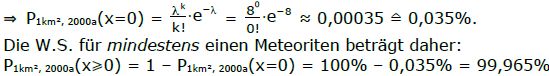 b) Für λ gilt natürlich unverändert λ=8. Allerdings soll nicht genau ein Meteorit fallen, sondern mindestens einer. Das sind viele Fälle [k=1, k=2, k=3, … k=∞], daher verwenden wir das Gegenereignis, also den Fall k=0.