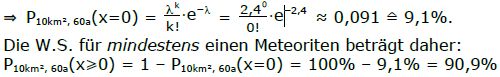 Betrachtet man die Zeitspanne von 60 Jahren, so ist das 60/1000=0,06 mal mehr, es gilt λ=4·0,06=0,24. Die Fläche wird nun 10 mal größer, das sollte also bedeuten, dass auch 10 mal mehr Meteoriten runter fallen. ⇒ λ=0,24·10=2,4.