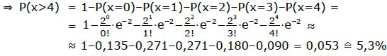 c) Es sollen mehr als vier Leute warten. Das sind leider prutahl-viele Fälle. (nämlich 5 Leute, 6, 7, 8, … ∞). Um diese Fälle alle zu berechnen braucht man sehr lange. Wir verwenden eine wahnsinnig schlauen Trick und berechnen das Gegenereignis.