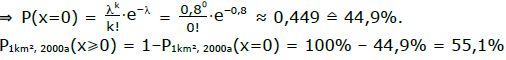 a) Für 1km² und 1000 Jahre werden vier Meteorit erwartet. Für 1 km² und 2000 Jahre werden 2 mal mehr Meteoriten erwartet, also λ=8. Es soll genau ein Meteorit fallen ⇒ k=1.