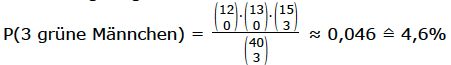 In einem Ufo befinden sich 12 blaue, 13 rote und 15 grüne Männchen. Eine Delegation von 3 Männchen besucht die Erde. Wie hoch ist die WS., dass es sich um drei grüne Männchen handelt?