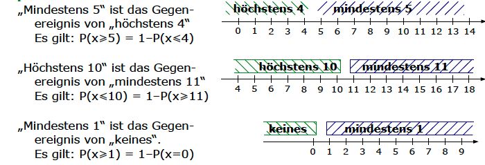 Somit liefern die Worte „höchstens“ und „mindestens“ immer eine kumulierte W.S. [eine kumulierte W.S. ist immer eine Summe von mehreren W.S.]. Die Grundidee ist recht einfach, wenn man sich das Ganze am Zahlenstrahl vorstellt.