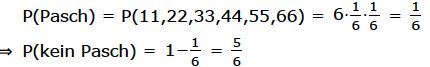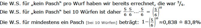 ⇒ P(mind. ein Pasch) = P(x>5) = 1–0,162 = 0,838 ? 83,8%