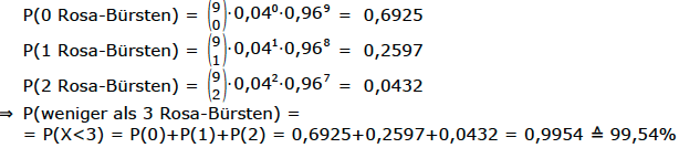 Wir brauchen also die WS., dass keine Rosa-Bürste, eine Rosa-Bürste oder zwei Rosa-Bürsten gezogen werden. Es handelt sich um „ohne Zurücklegen“, da jede Klobürste eine WS. von 4% hat, egal wieviel und was gezogen wird.