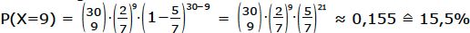 Danach überlegen Sie sich, dass die Gesamtanzahl 30 beträgt ⇒ n=30, die W.S. am WE Geburtstag zu haben liegt bei 2/7 ⇒ p=2/7 und wir suchen die W.S., dass dieses Ereignis bei 9 Leuten eintrifft ⇒ k=9.