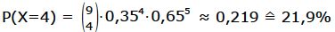 Sie hacken die tollen Befehle in Ihren Taschenrechner und erhalten: P(X=4) ≈ 0,219 ? 21,9%
