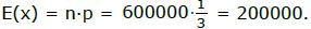 Der Erwartungswert für „A“ ist nicht anderes als die Anzahl der Apfel-Felder, die bei 600.000 Drehungen erwartet werden. [Das ist natürlich ein Drittel von 600.000, wir rechnen das aber stupide aus]. Die Formel für den Erwartungswert lautet: